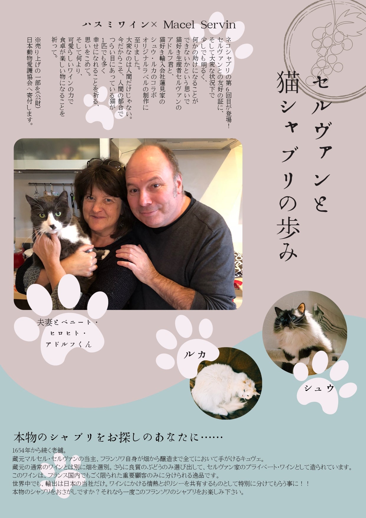 今年も猫シャブリが入荷いたしました。セルヴァンさんとの友好の証、そしてどんな状況でも明るく、何かの助けになりたいという思いでオリジナリルラベルを毎年作成しています。