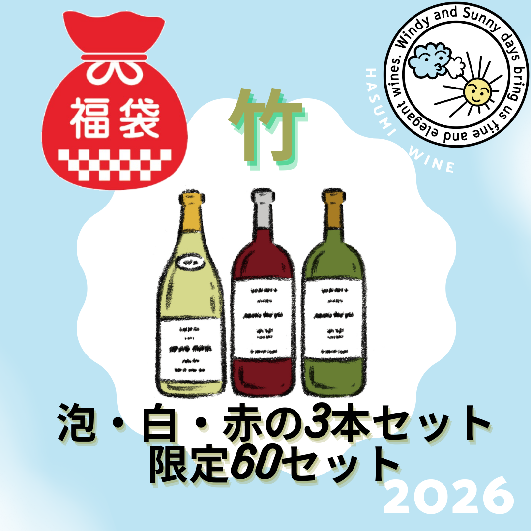 21日まで!【限定60セット】2026年ハスミワイン福袋・竹🎍〜泡・白・赤の3本セット〜(※ギフトラッピング不可)15,400円(税抜14,000円)今年もやります!ハスミワインオリジナルのフライング福袋!それぞれ、泡・白・赤の3本セット。送料無料の、お得な高品質セットです。