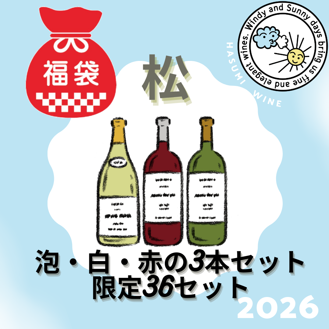 21日まで!【限定36セット】2026年ハスミワイン福袋・松🌲〜泡・白・赤の3本セット〜(※ギフトラッピング不可)22,000円(税抜20,000円)今年もやります!ハスミワインオリジナルのフライング福袋!それぞれ、泡・白・赤の3本セット。送料無料の、お得な高品質セットです。